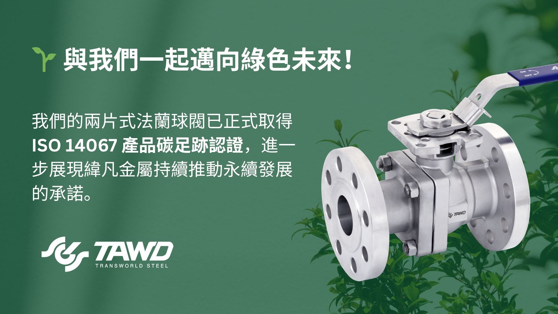 我們的片式法蘭球閥已正式取得 ISO 14067 產品碳足跡認證,進一步展現 TAWD 對永續發展的承諾。